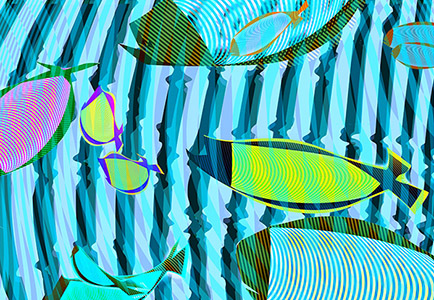 Aquarius and Horses are somewhat the reverse of the techniques explained above. They are the result of a reconstruction, or better said, a construction of an ultimate artistic perception by using a cinetique technique or, more generally, creating an illusion in an OpART technique. In this case the work starts by creating original colored line templates and marrying/fusing these with real world objects, including at times photographs, then obtaining a photographic interpretation of a newly created subject.